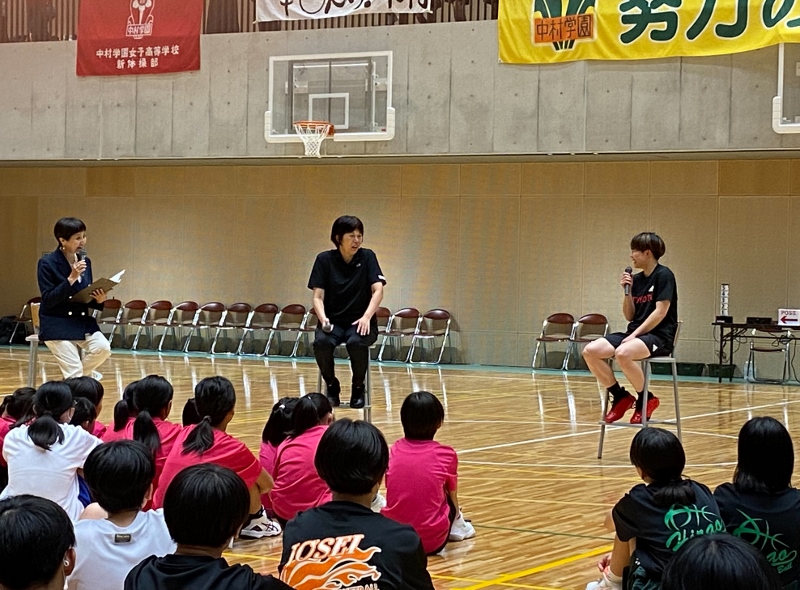現役バスケットボール部在校生、アンテロープス安間選手、鶴屋監督 鹿毛さんとのトークショーや近隣中学校バスケットボール部の生徒さん達のフリースローチャレンジなど、大変盛り上がりました。